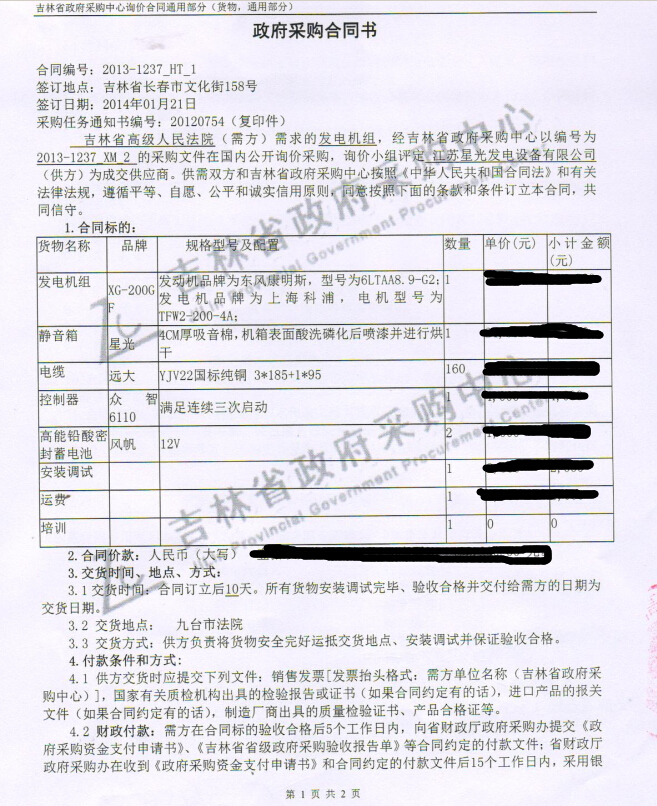吉林省高級(jí)人民法院政府采購(gòu)200KW發(fā)電機(jī)組: