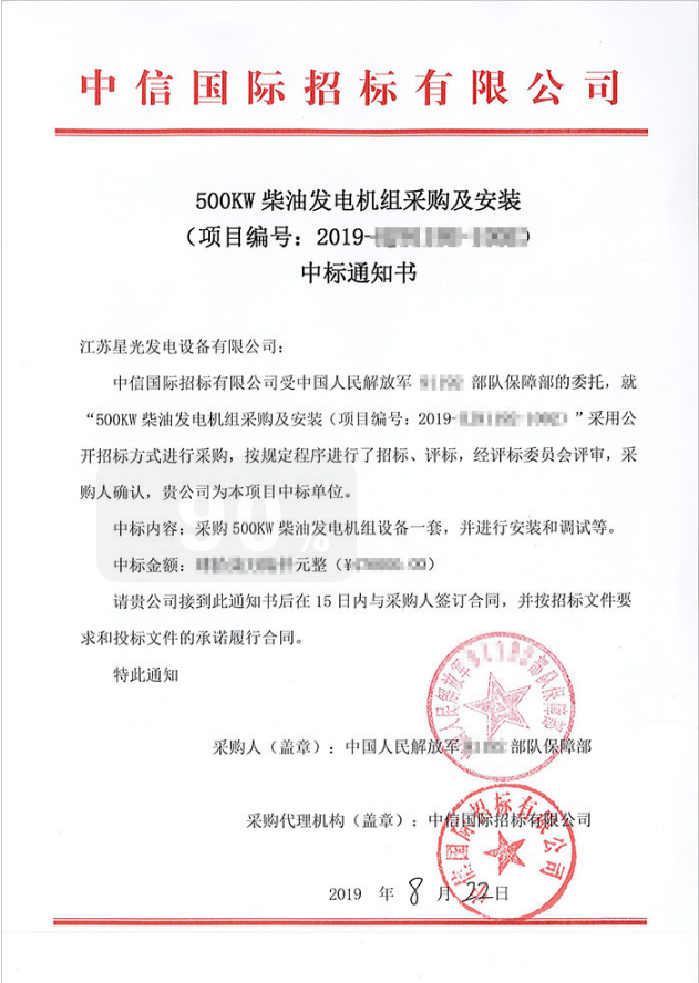 近日,我公司憑借公司實力,再次中標中國人民解放軍某部隊后勤保障部一臺500kw柴油發電機組,本次中標的項目采用公開招標方式進行采購,經評標委員會嚴格評審以及采購人確認,星光公司憑借先進的檢測設備、現代化的生產工藝、雄厚的研發技術實力、專業的制造技術、完善的質量管理以及售后服務保障最終在眾多競爭對手中成功中標該項目。